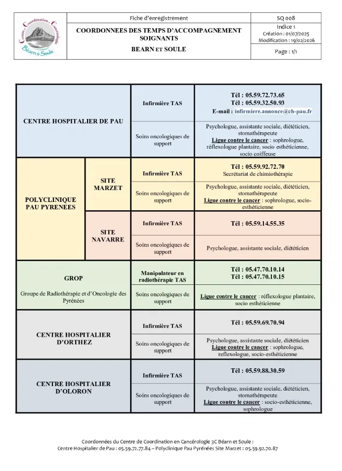 Dispositif qui existe dans tous les établissements autorisés ou associés pour traiter le cancer. il est composé d’une infirmière, d’une psychologue, d’une assistante sociale, d’une diététicienne, d’une socio esthéticienne, d’une manipulatrice en radiothérapie, de soins supports (réflexologie plantaire, sophrologie…). ce temps prend en soins le patient mais également sa famille proche.